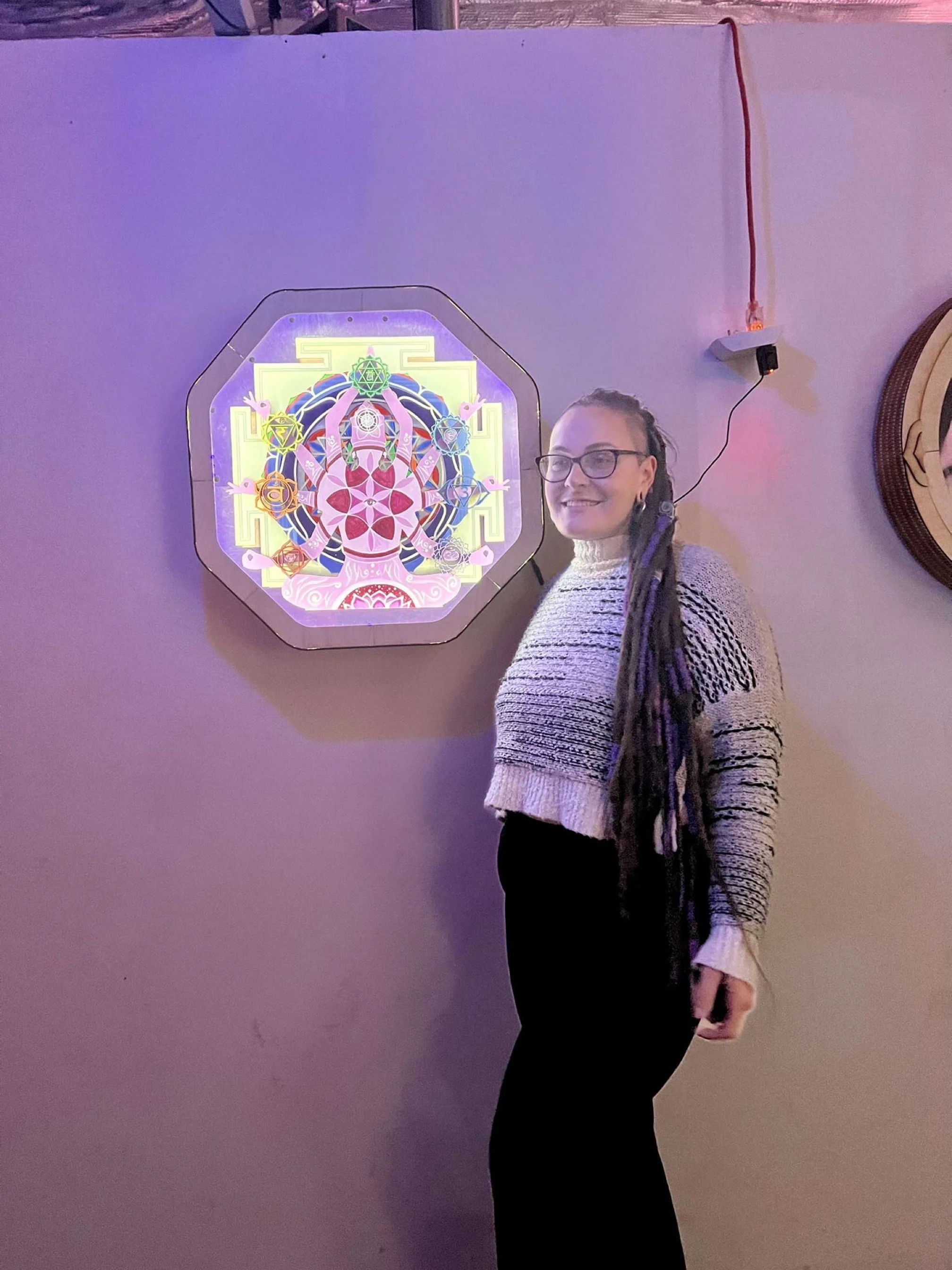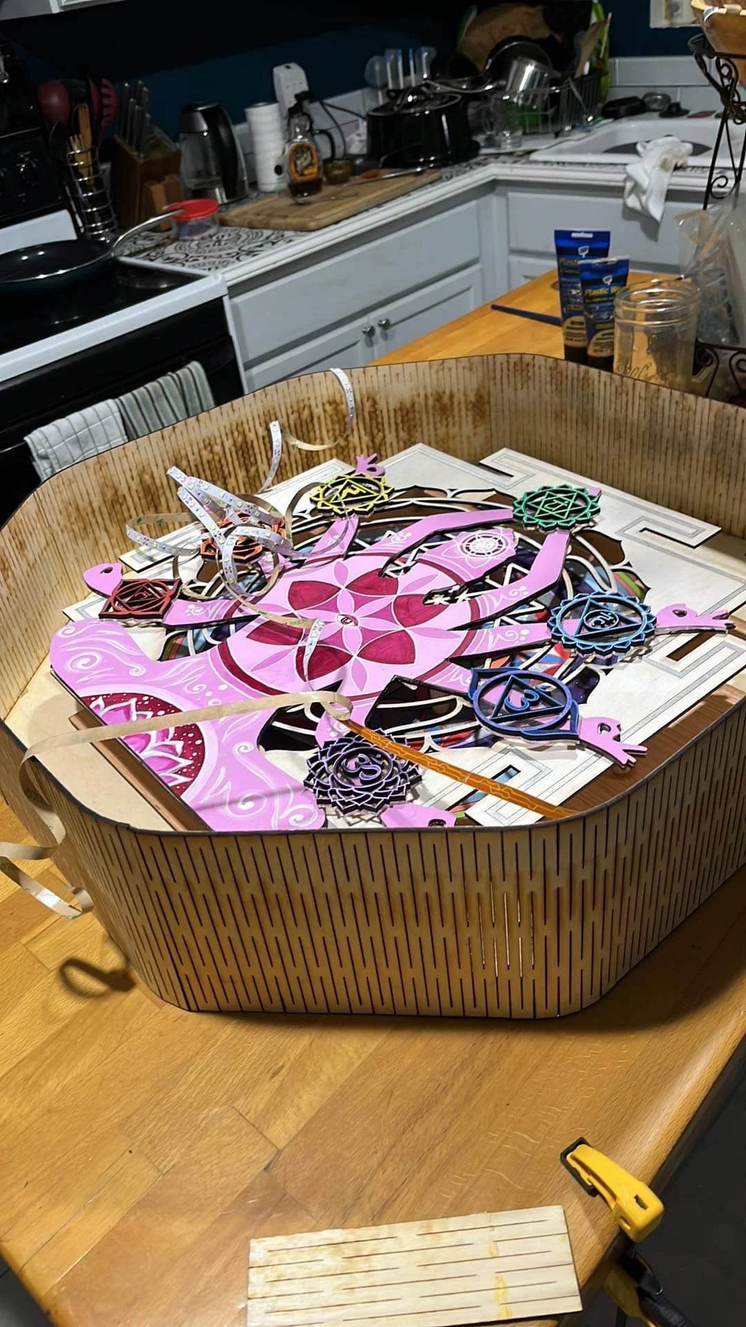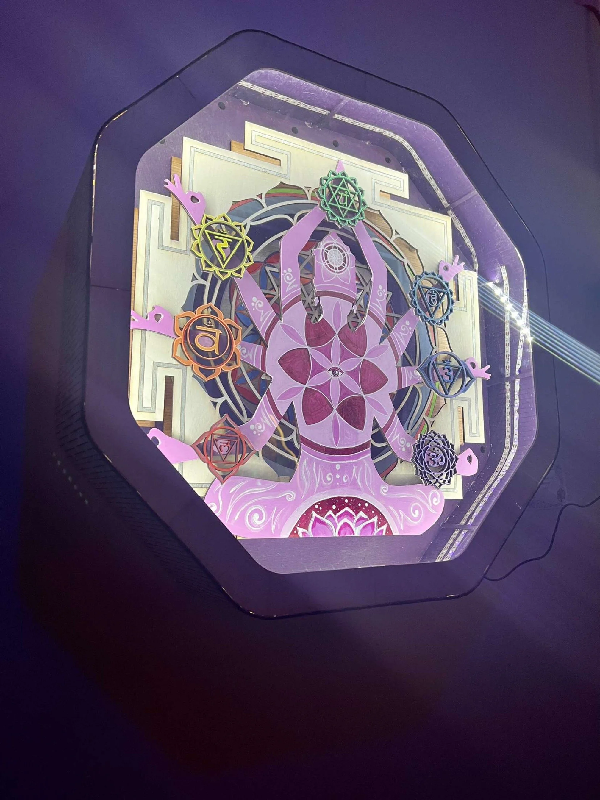 Laser-cut silhouette created by InnerG Art, painted by Marisa Rose. After painted, lighting and framing was done by InnerG Art. This piece was created alongside collaborations with over a dozen other painters from all over the globe. The body of work, entitled Worlds Within Worlds, was featured at Scorpio Palace in Denver, CO, and will be featured at other locations in the near future.