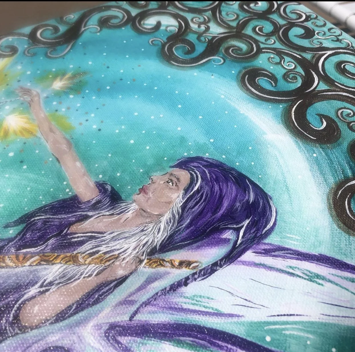This very special painting was created from 🌕 full moon to full moon 🌕 begun at an Erothyme full moon show, and completed at the Rising Appalachia full moon show….a very fast piece for me, but a very very potent vision that I just HAD to get out! Swipe for some juicy detail shots, and to see the original ‘hermit’ card from the Rider-Waite deck.